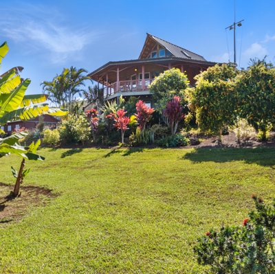 These 5 manicured acres are such a surprise with a variety of fruit trees, coffee, mac nut, palms. There is also a very large sectioned garden with a variety of herbs, fruits (white pineapple!), etc., and also noteworthy, are the many ornamentals that grace the property.