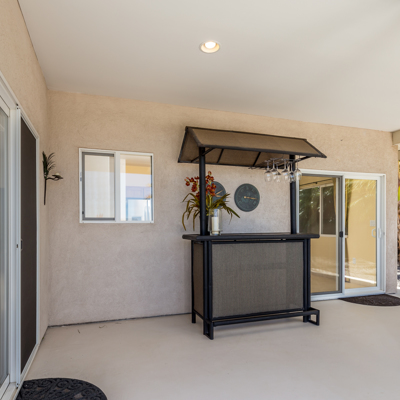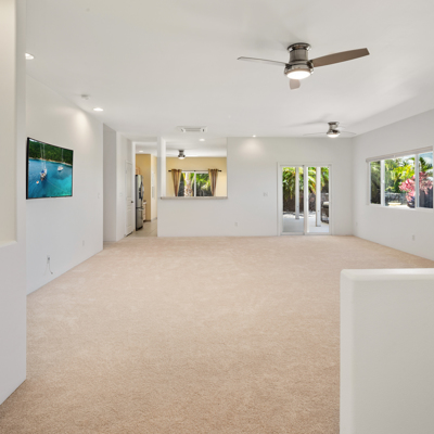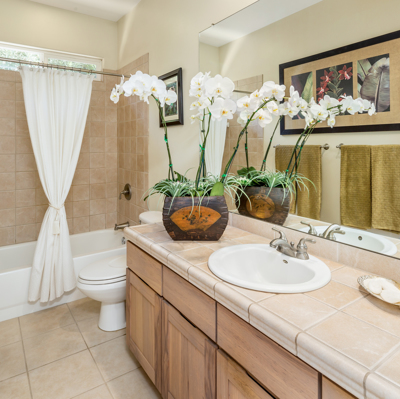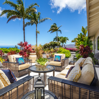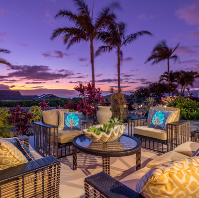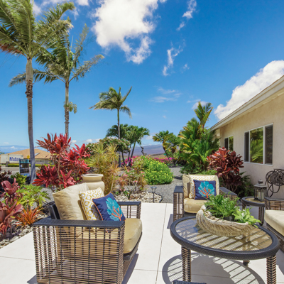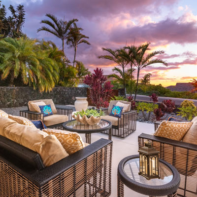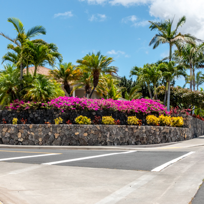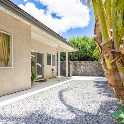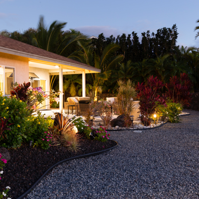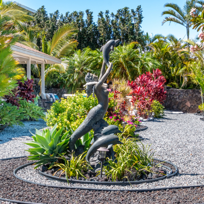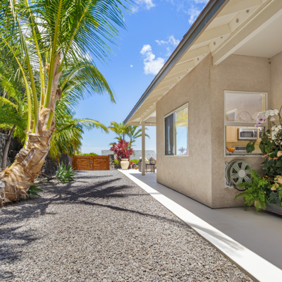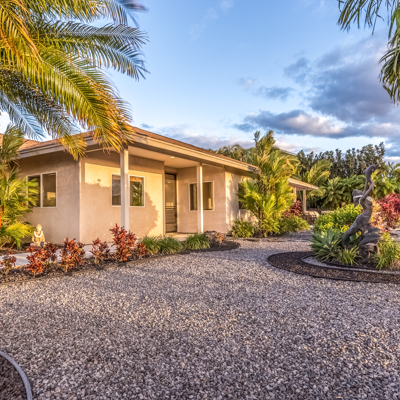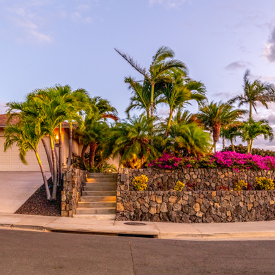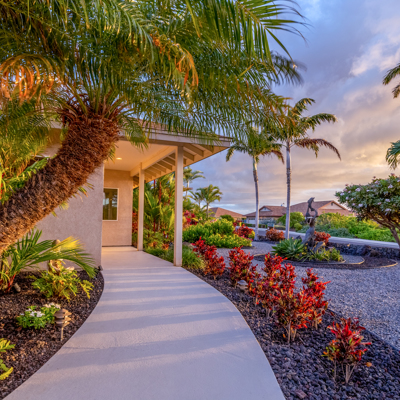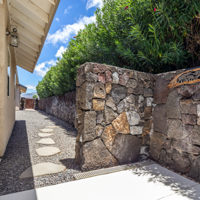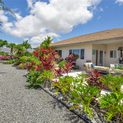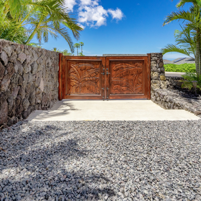 EXTERIOR Back rock wall (single 6') South rock walls (double 6' wall with 4' planters) Front rock wall (double 6' with 4' planters) Front concrete stairs (with rock wall sides and built-in lights) Front gate (hand carved from Bali) with (IPE hardwood) Side gate (custom made) with (IPE hardwood) Lanai concrete extension New Driveway (holds 3 cars across and 2 deep - 6 cars total) Hot tub concrete pad including 220v hook up Plumbing for outdoor shower Outdoor lighting New 1" Driscoll water line encased in a 4" PVC sleeve Sun Shades by Bali installed LANDSCAPING Award winning design - by the Outdoor Circle AND the Waikoloa Village Association