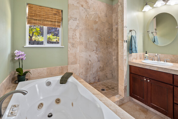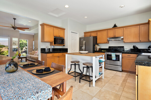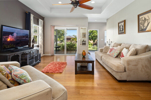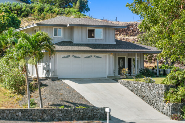 Great flowing layout with Master bedroom downstairs and 2 bedrooms and 1 full bath upstairs along with a loft office or play room with closet. 9' ceiling and coffers throughout and a front lanai access from Living room. Bedrooms are all very nice sized. Another convenient 1/2 bath downstairs. Open and Large workable kitchen with travertine tile flooring and a bay window in the dining with sliding doors out to private back lanai. Master Bath boasts a double sink, Jacuzzi tub and walk in tiled shower. Master bedroom has access to back lanai. A small dog yard for those furry pets. Some ocean views and a beautiful Kohala coast view. Conveniently located across from the park and athletic field and playground. And an easy walk to Waikoloa School. School goes from Kindergarten to 8th grade. Waikoloa Village is a sweet community, centrally located between Kamuela to the north and Kona to the south. It is the closest community to the resort coastal area (@15 minute drive) with golf, dining, shopping, luxury resorts and world-class beaches. Waikoloa Village itself has many amenities including a shopping center (with another one under construction), post office, Robert Trent Jones golf course, tennis, stables and community pool. Please visit Waikoloa.org for more information. Mandatory membership in the Association is required. Members are allowed access to the brand new pool, and discounted golf rates.