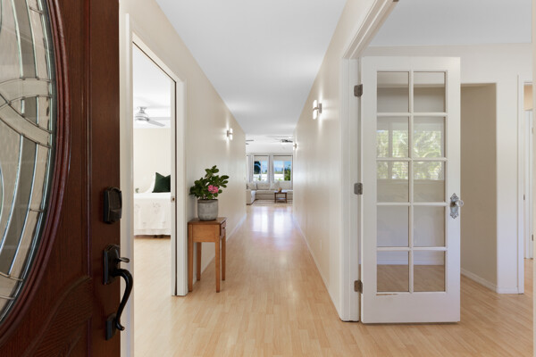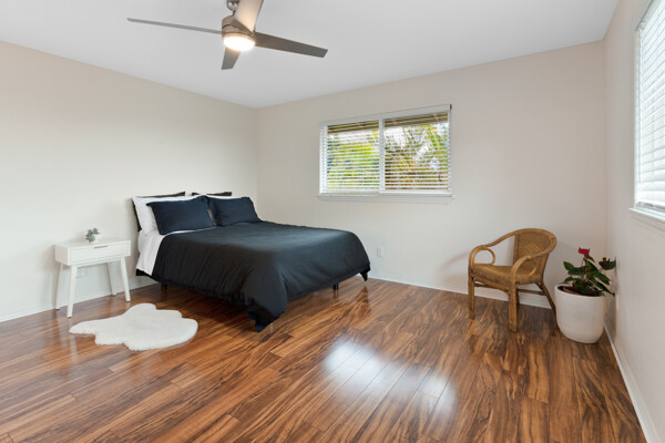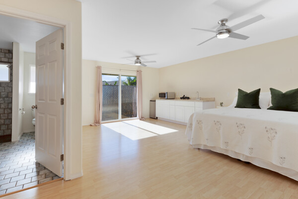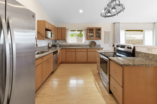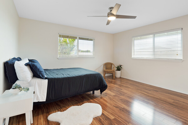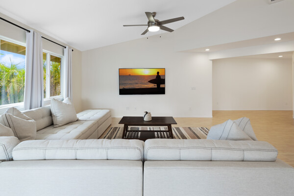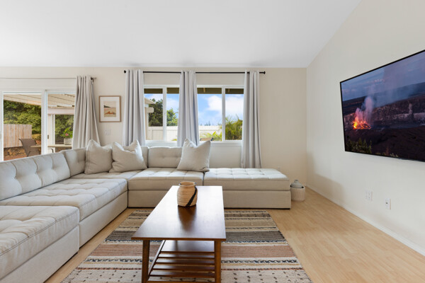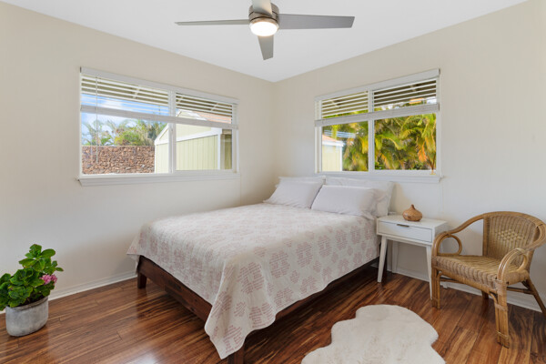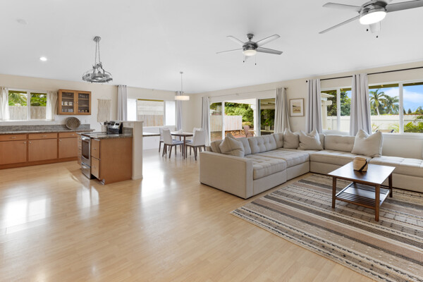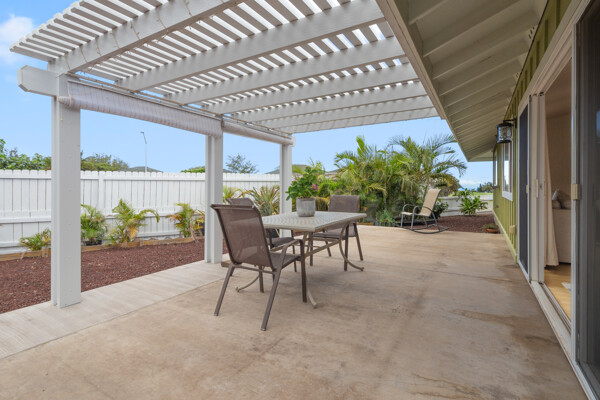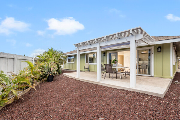 Island style living at its best! Welcome home to this bright and airy open floor plan with vaulted ceilings, large picture windows and fenced in yard for your furry friends. The kitchen is a dream with lots of granite counter tops, island breakfast bar and adjacent dining area. The living room is the heart of the home with vaulted ceilings and tons of space, perfect for entertaining. This home features 2 primary suites and a third bedroom. The 2 primary suites are on opposite sides of the home for the utmost privacy. One could easily be turned into an Ohana for extra income. The other has an ocean view and both have large walk-in closets. More features include: