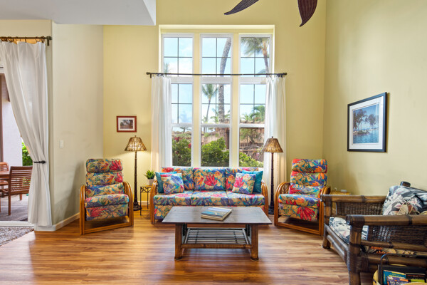 18' ceilings in the great room with a wall of windows that frame the lovely lagoon pool with waterfall beyond and is framed by the beautiful Hualalai mountain.